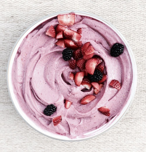 - Alpro yoghurt + banaan + aardbeien + blauwe bessen + noten en zaden.